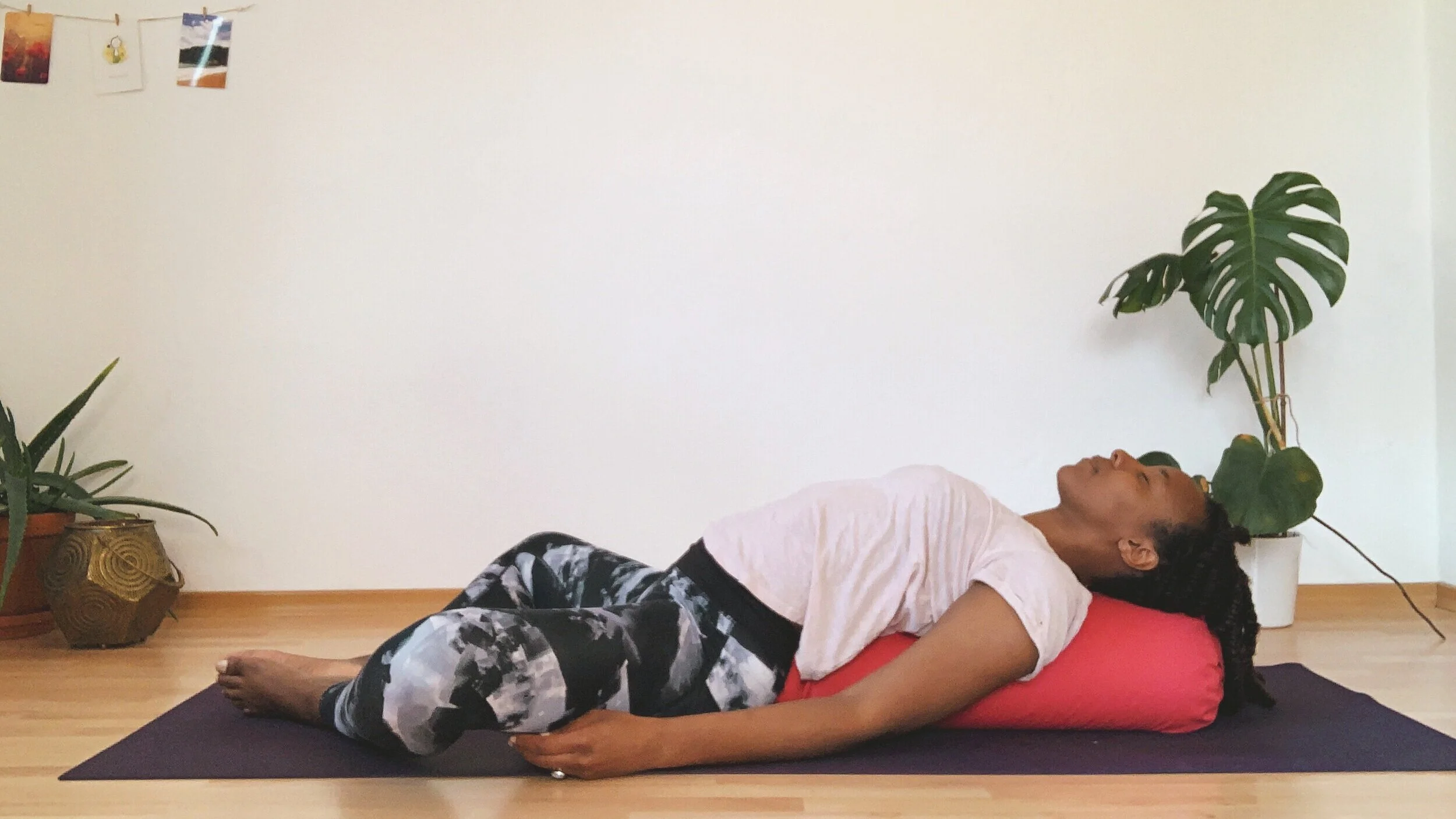 Again, if you’ve got lower back pain, I recommend using a block or cushion under your bolster to lift it a little higher. If your hips and knees feel vulnerable, prop them up with blankets or cushions. For an extra bonus, use an eye pillow or cloth to drape over your eyes.