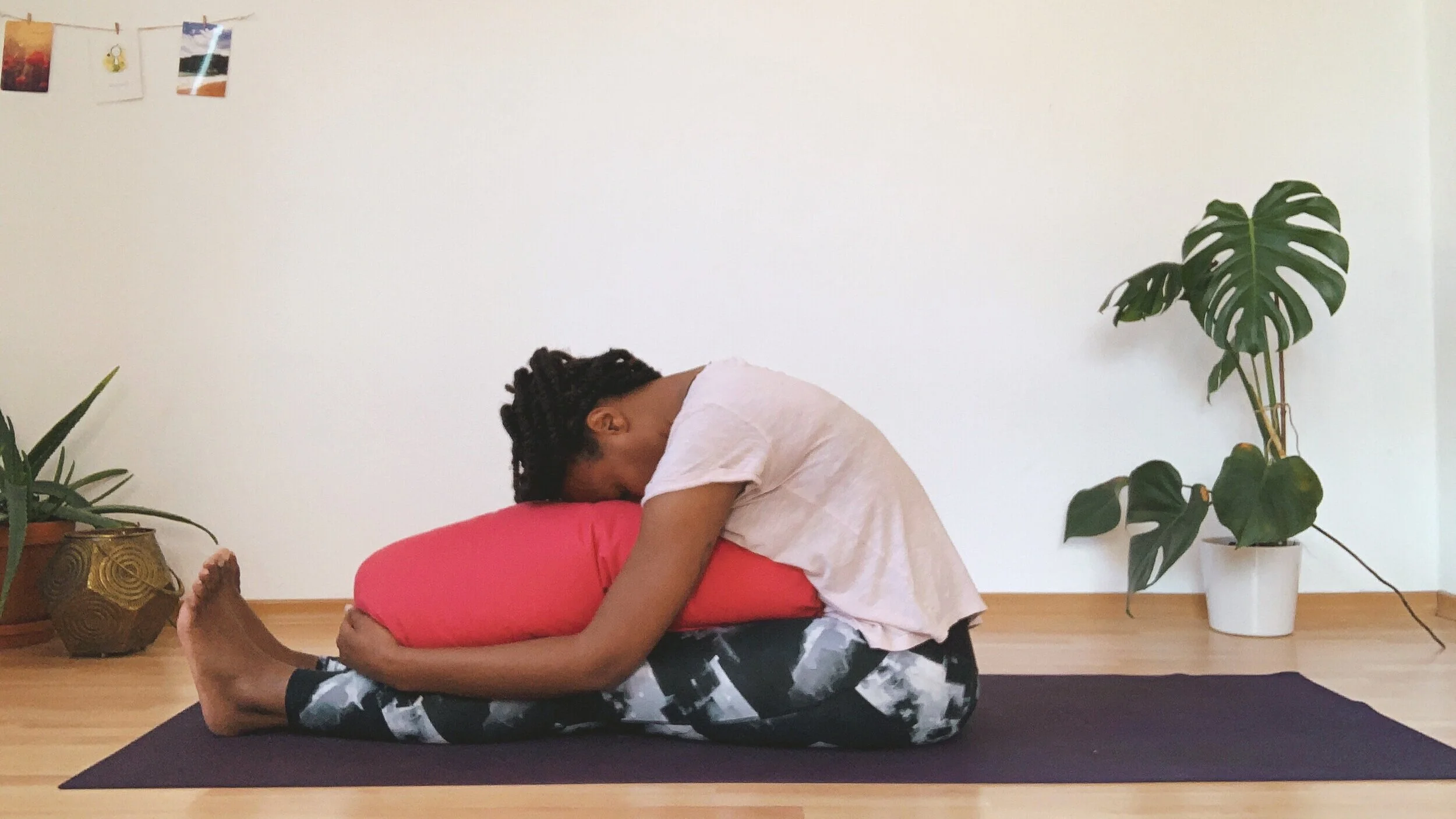 Sit on the ground with your legs together and a slight bend in your knees (I recommend popping a rolled up blanket under them). Lay your bolster (or substitute) to rest on your legs, and start to roll your upper body forwards until it rests on your support. Be sure not to grab on your legs or toes - remember, this is about relaxation!